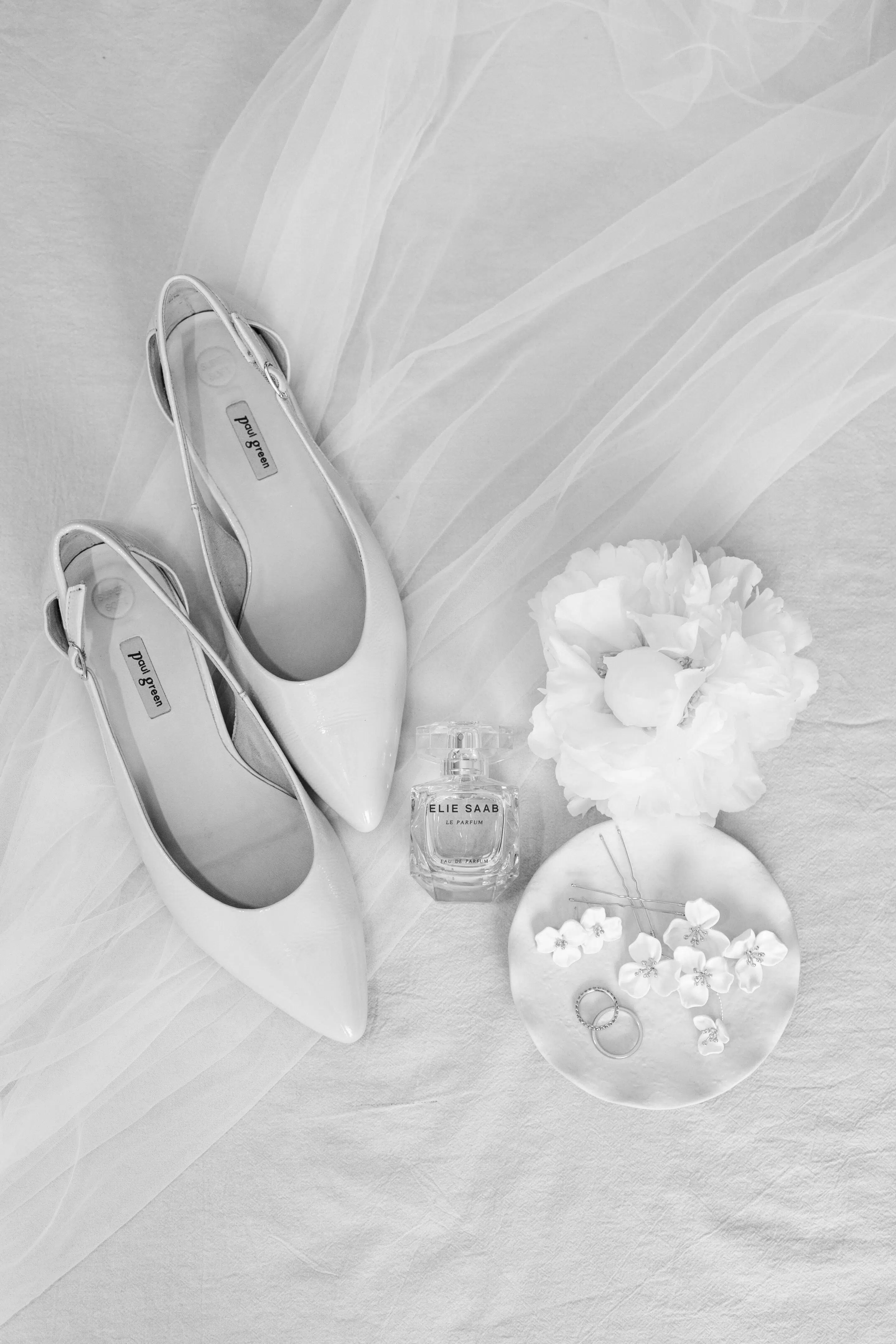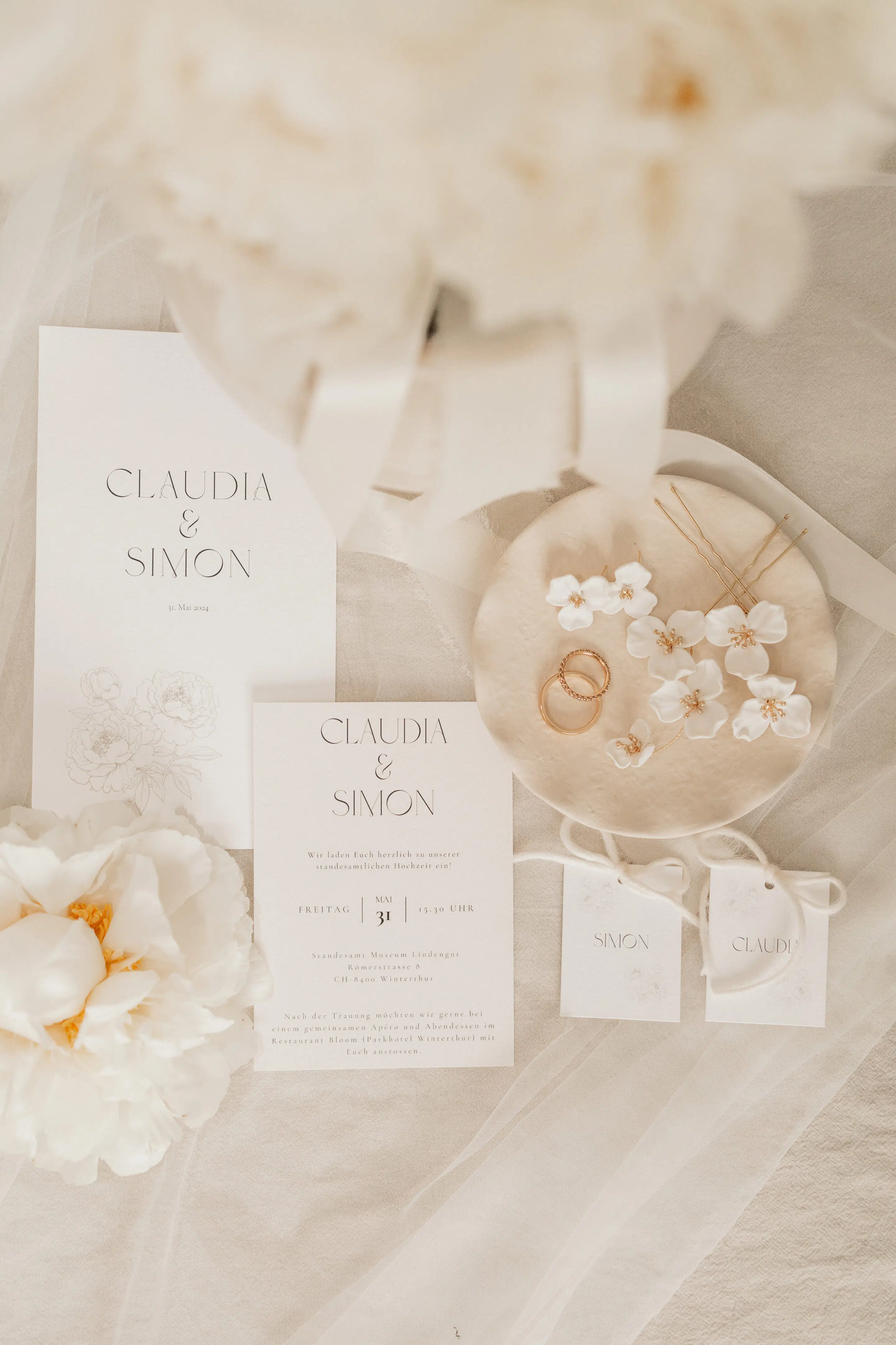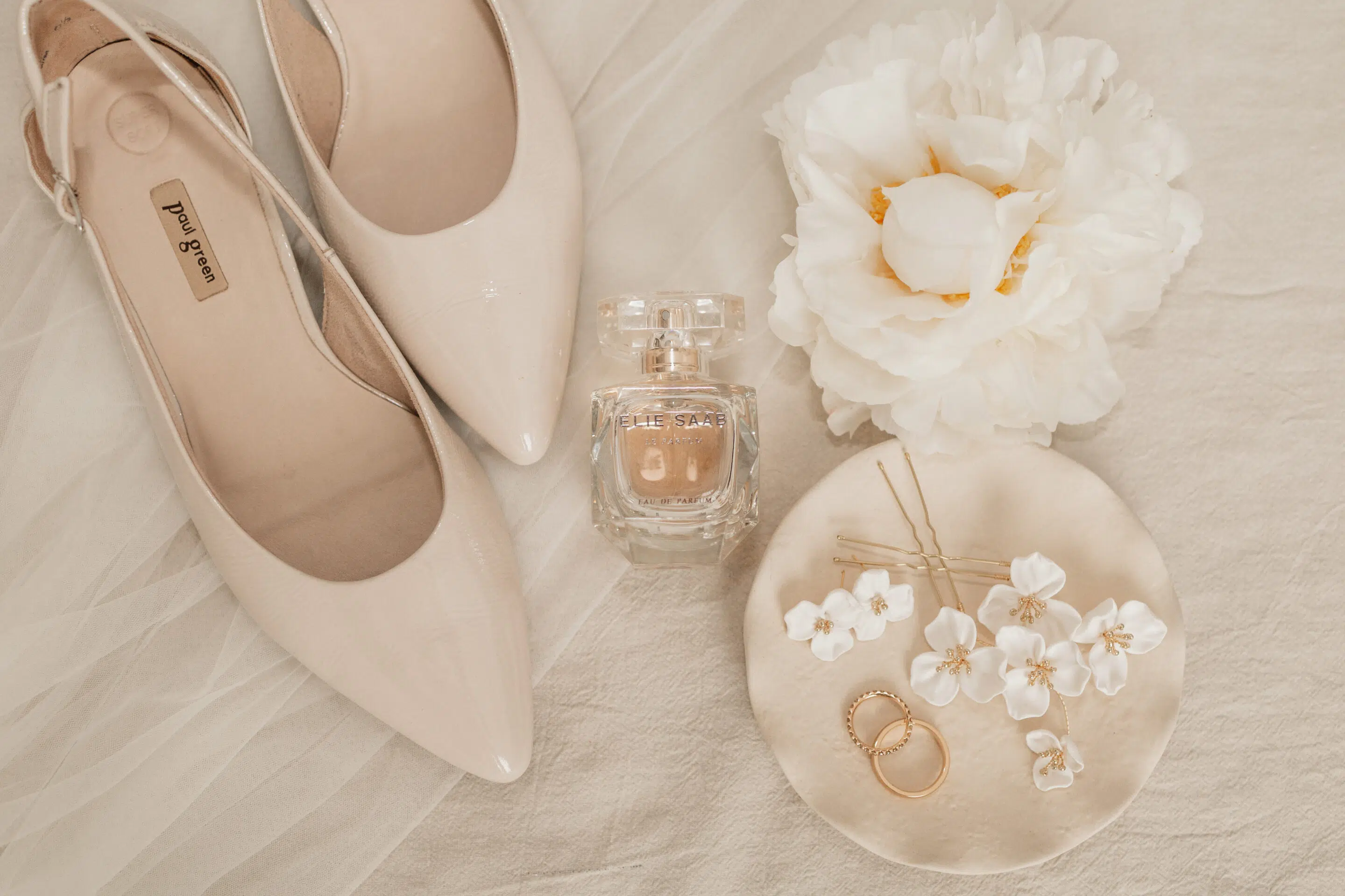 Eleganter Schmuck, weisse Blumen, minimalistische Papeterie, Parfüm und andere Accessoires wurden von Claudia mit viel Geschmack ausgewählt und zur Seite gelegt, damit wir uns austoben konnten in unserer Kreativität. Das Arrangieren der Hochzeitsgegenstände in Form eines Flatlays ist eine wunderschöne Variante die Details zu verewigen in Form von Hochzeitsbildern. Der perfekte Zeitpunkt dafür ist während dem Getting Ready. Denn die Fotos vom Makeup und den Haaren benötigen nicht allzu viel Zeit und zwischendurch entstehen kleine Pausen, die perfekt genutzt werden können um sich den Details zu widmen.