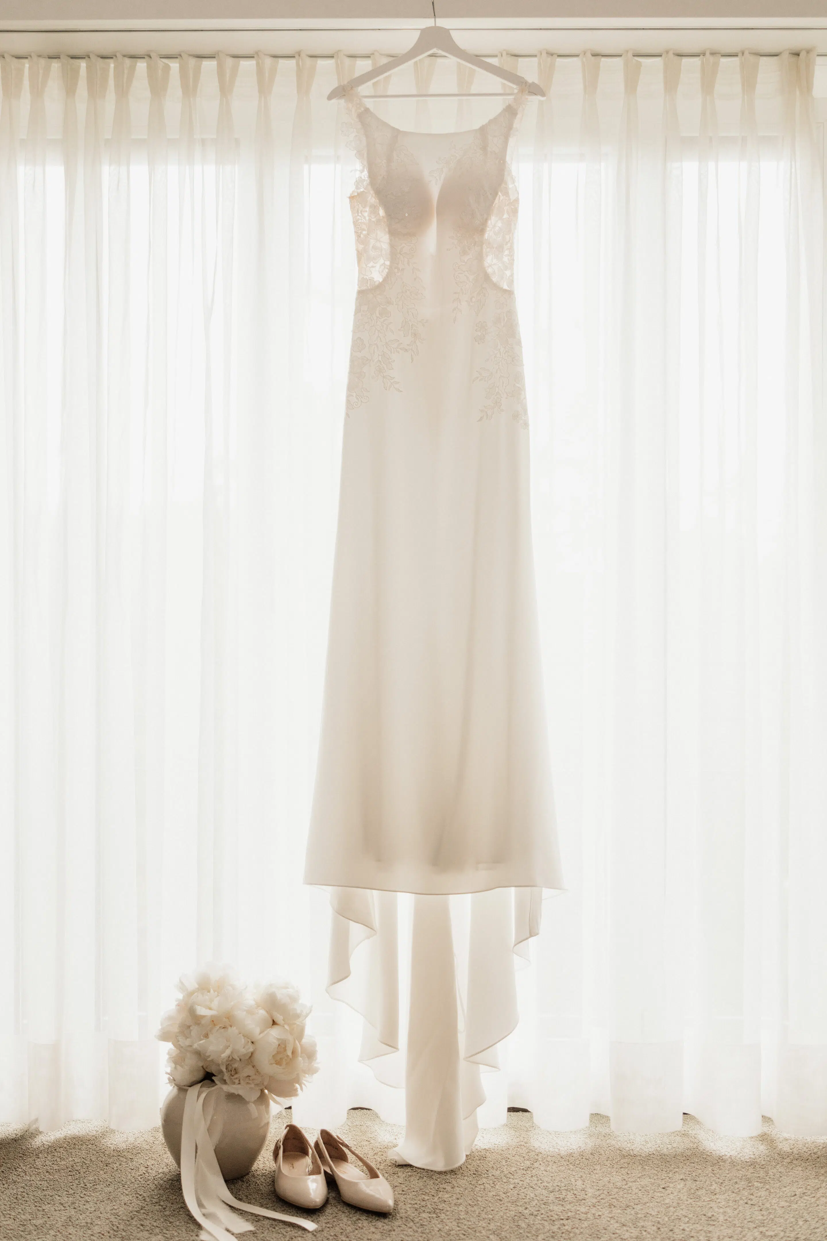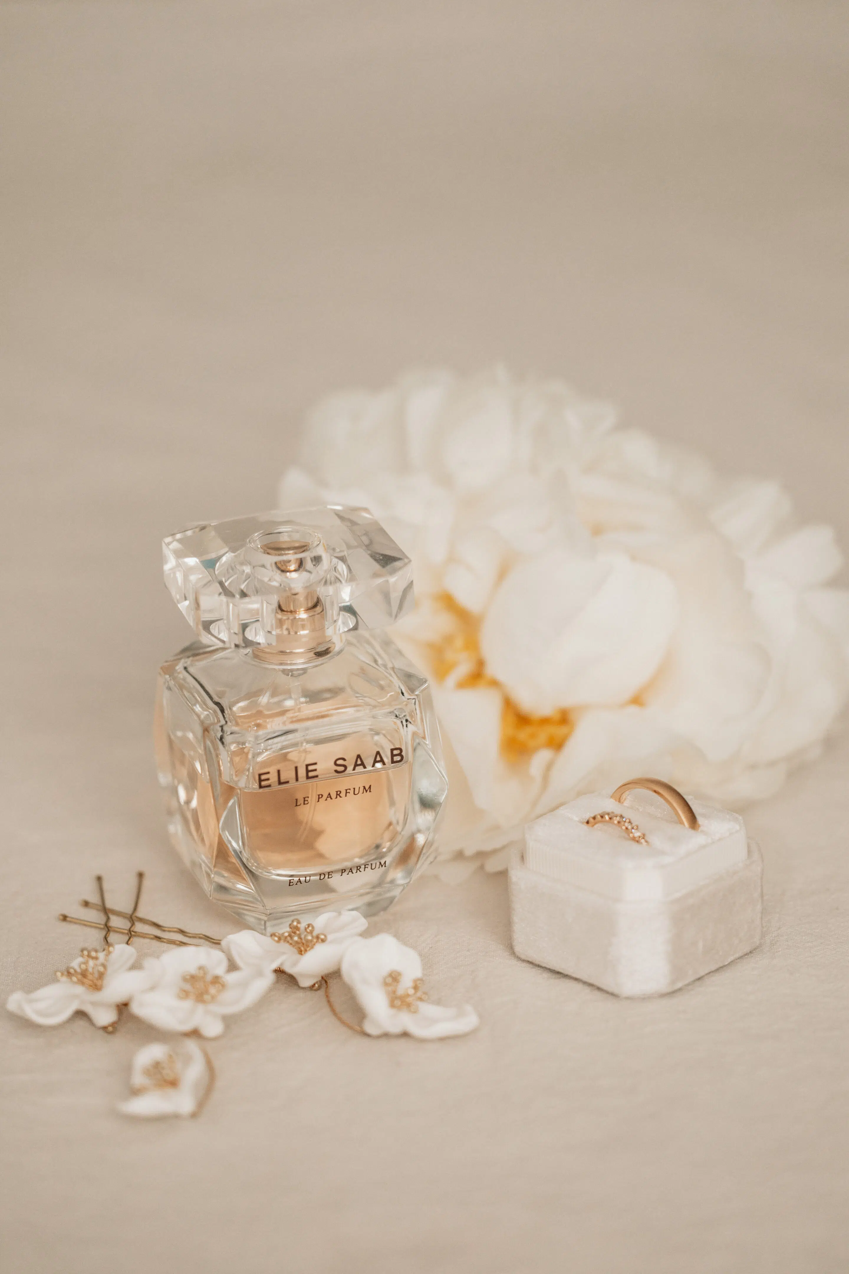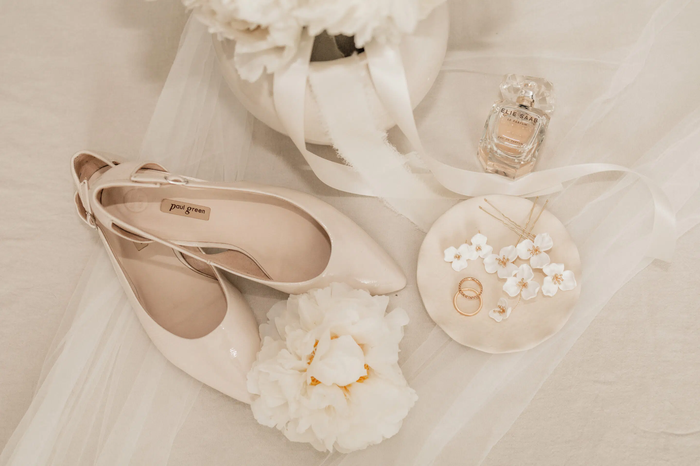 Eleganter Schmuck, weisse Blumen, minimalistische Papeterie, Parfüm und andere Accessoires wurden von Claudia mit viel Geschmack ausgewählt und zur Seite gelegt, damit wir uns austoben konnten in unserer Kreativität. Das Arrangieren der Hochzeitsgegenstände in Form eines Flatlays ist eine wunderschöne Variante die Details zu verewigen in Form von Hochzeitsbildern. Der perfekte Zeitpunkt dafür ist während dem Getting Ready. Denn die Fotos vom Makeup und den Haaren benötigen nicht allzu viel Zeit und zwischendurch entstehen kleine Pausen, die perfekt genutzt werden können um sich den Details zu widmen.