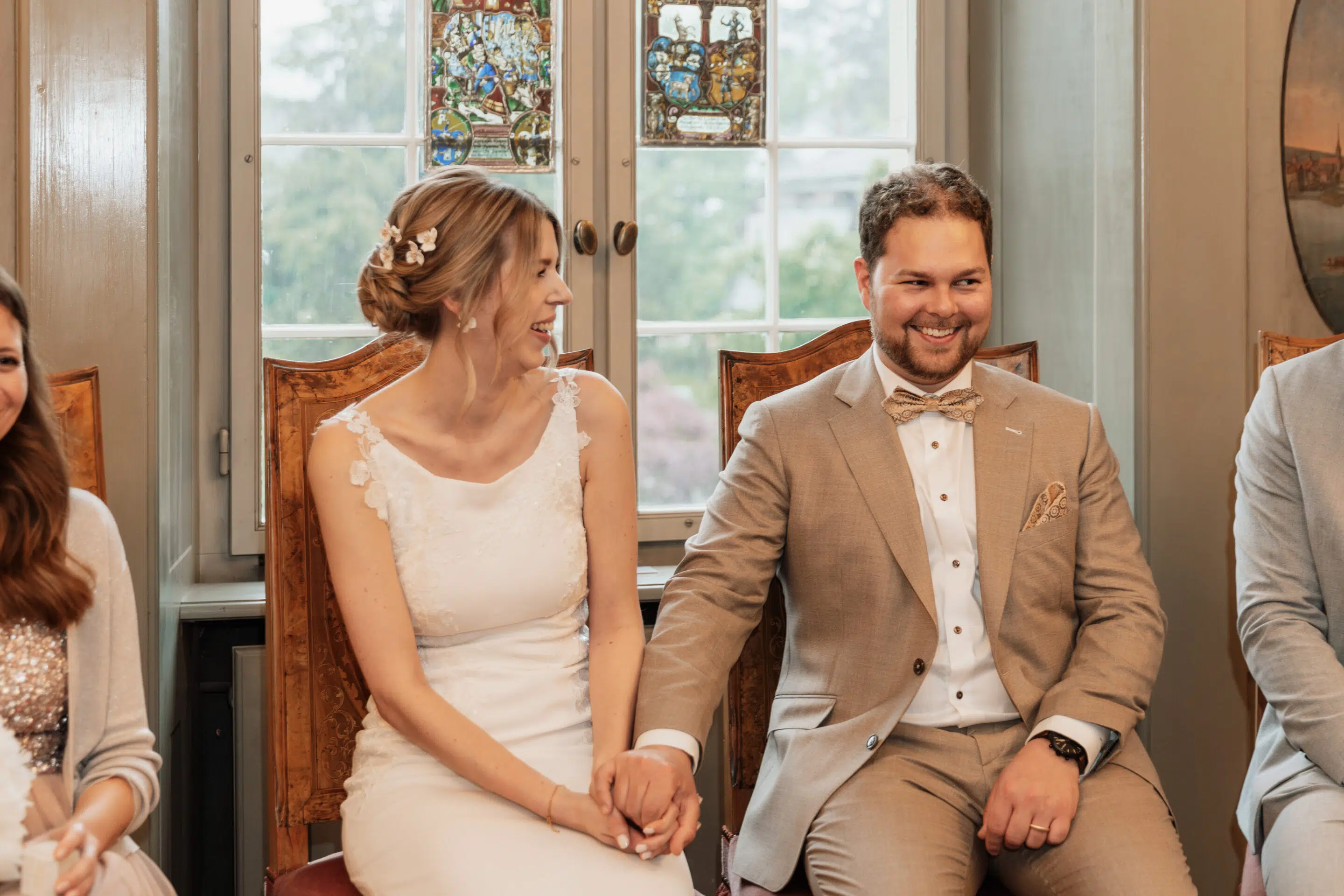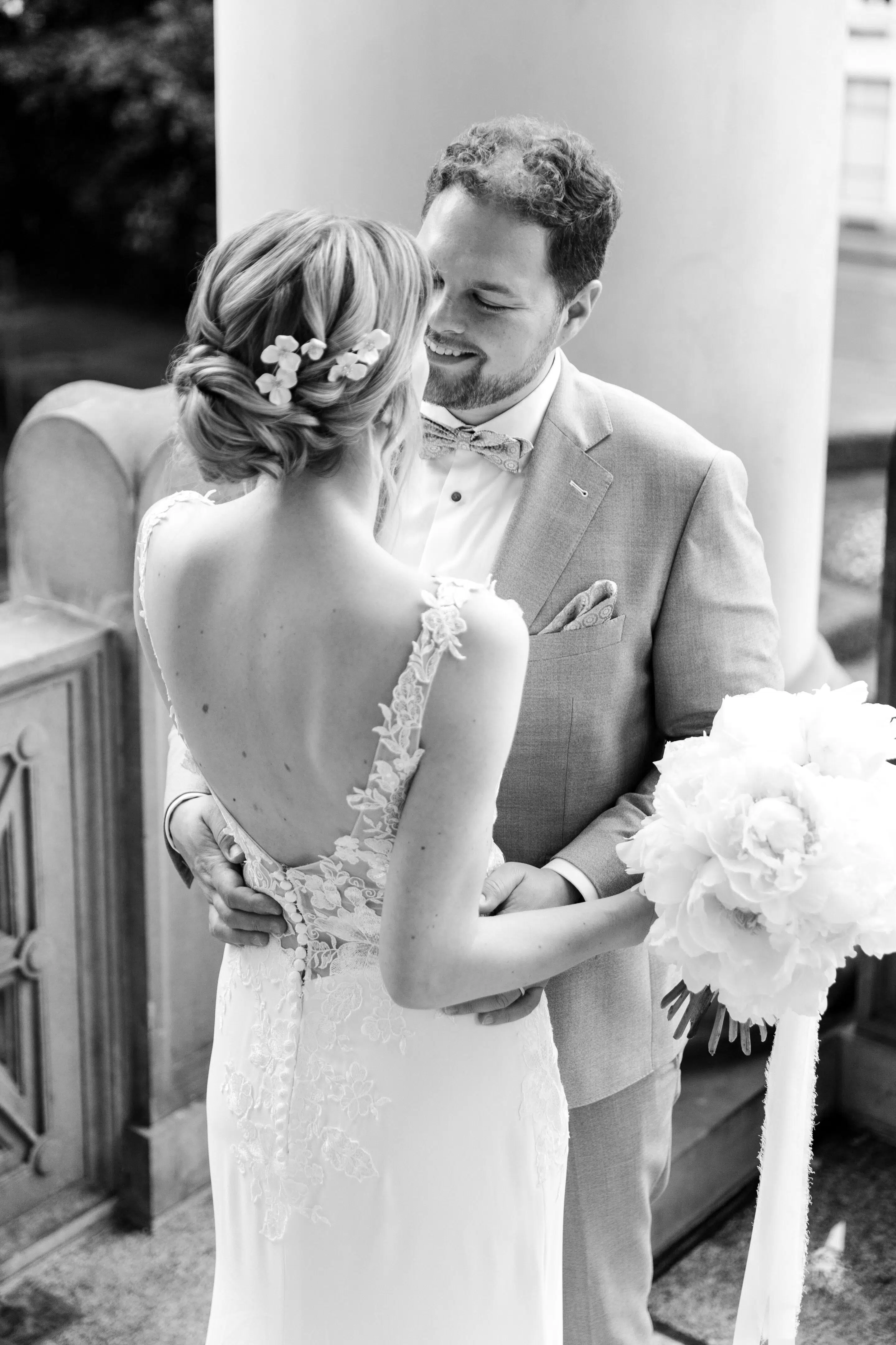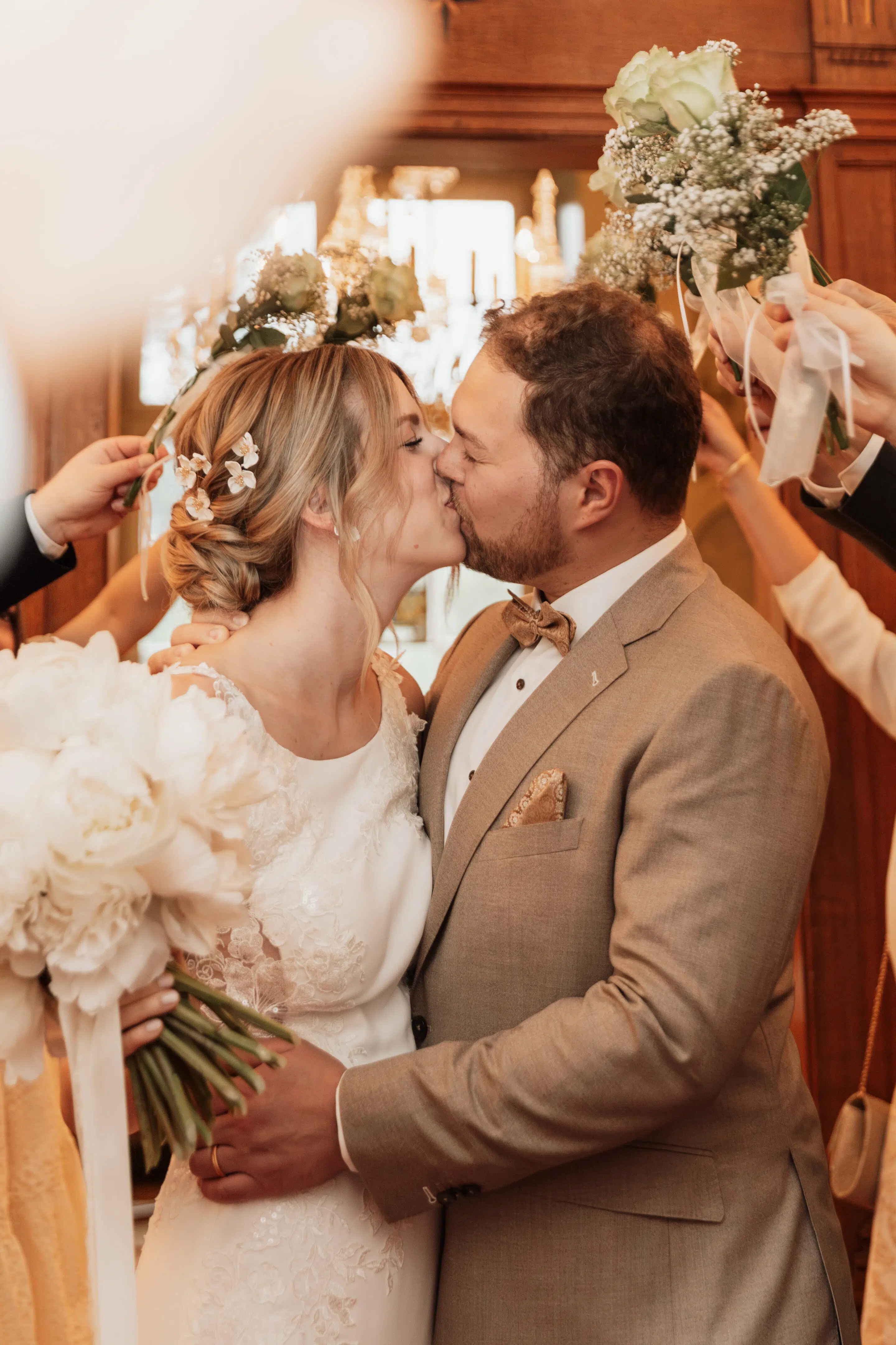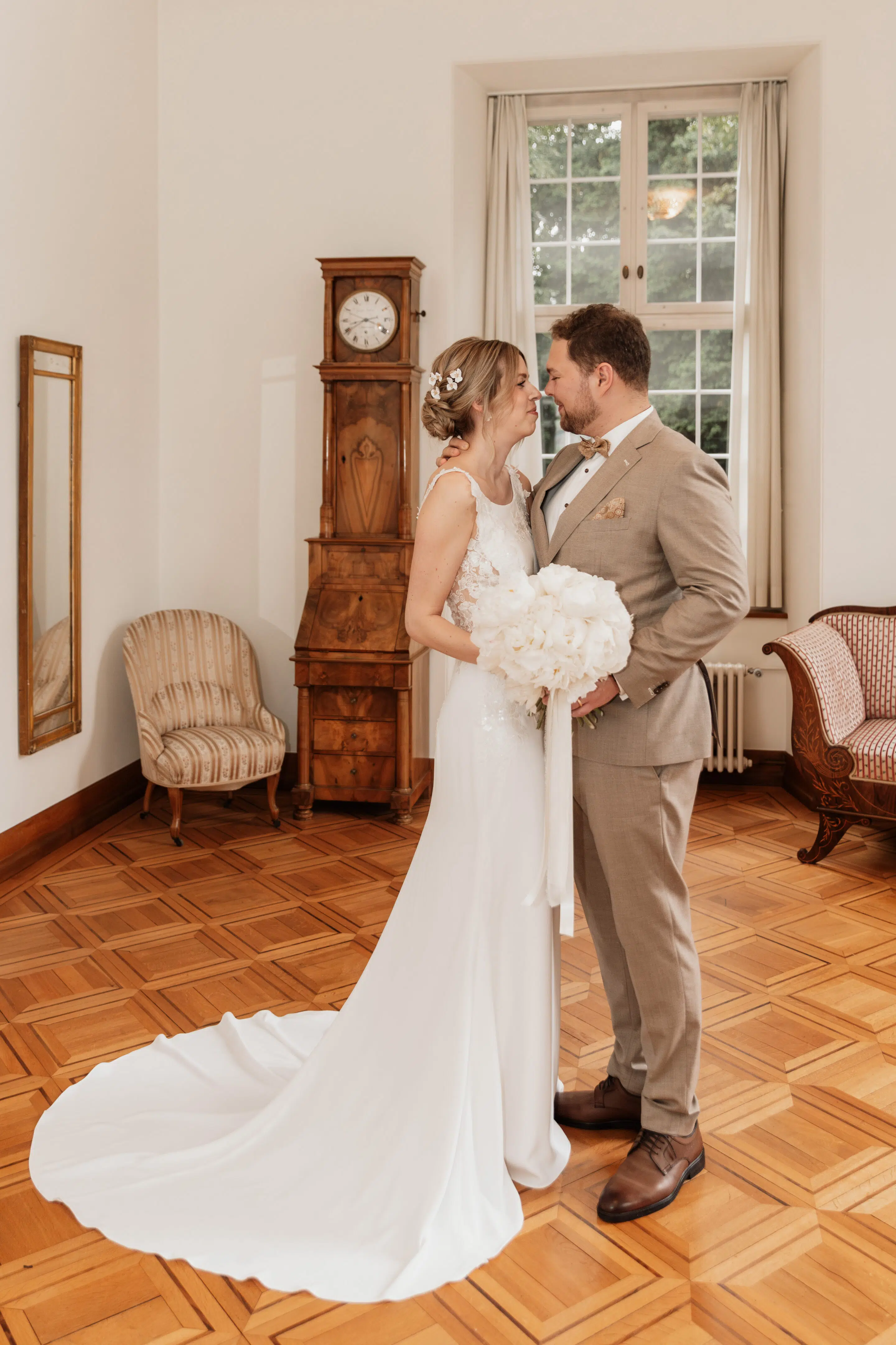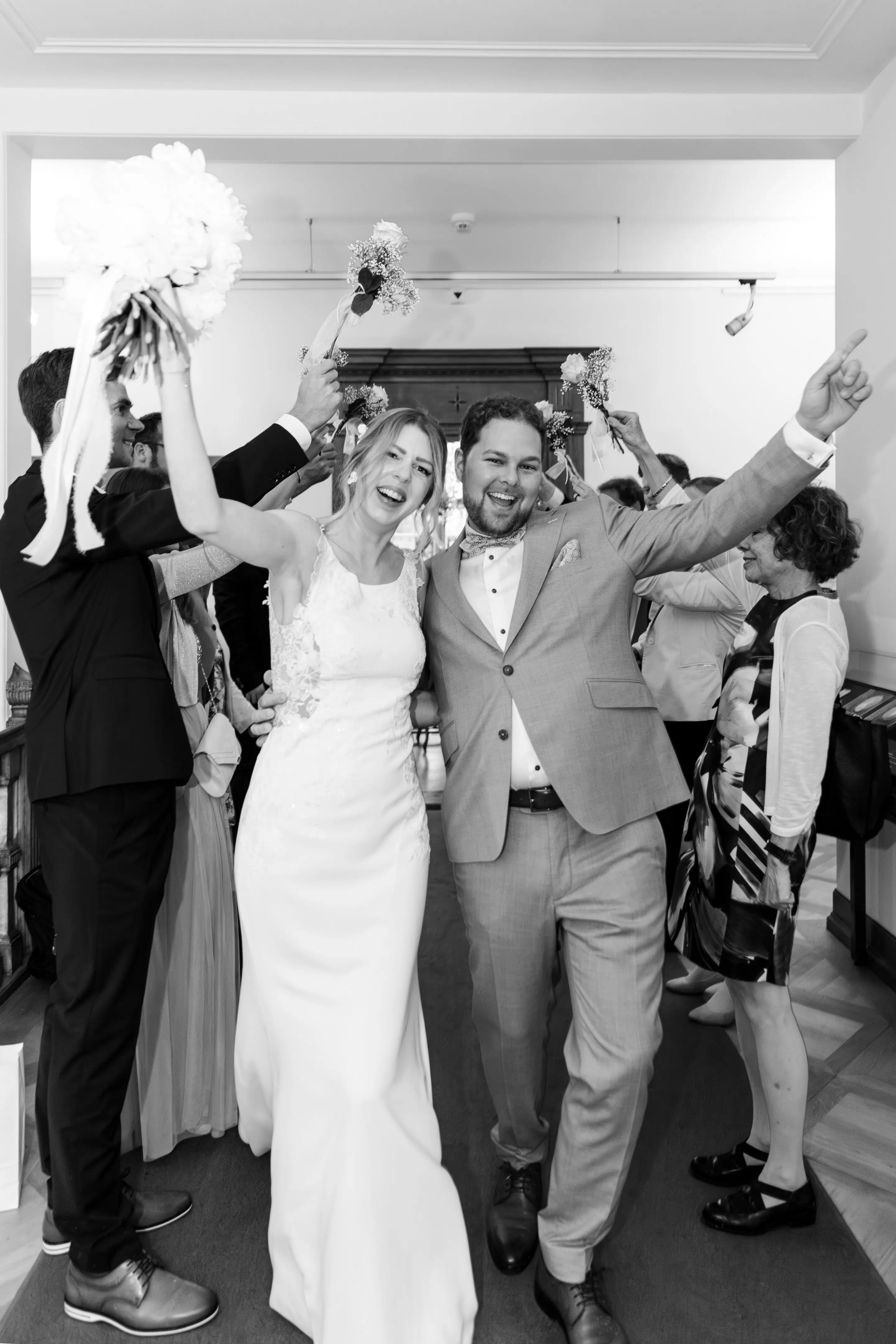 Nach dem Getting Ready war die standesamtliche Hochzeit in der Villa Lindengut in Winterthur und auch dort ist die Liebe geströmt. Natürlich zwischen Claudia & Simon, aber auch wieder in den Details. So haben die Familie und Freunde von den beiden einen wunderschönen Spalier mit weissen Blumen gemacht nach der standesamtlichen Trauung.